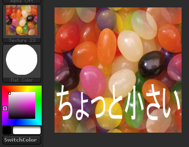 マテリアルをFlatColor(ただの白丸)に変更して、テクスチャにTexture23(ジェリービーンのカラフルなやつ)を選択して、Textrue>CropAndFill