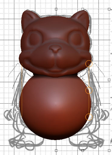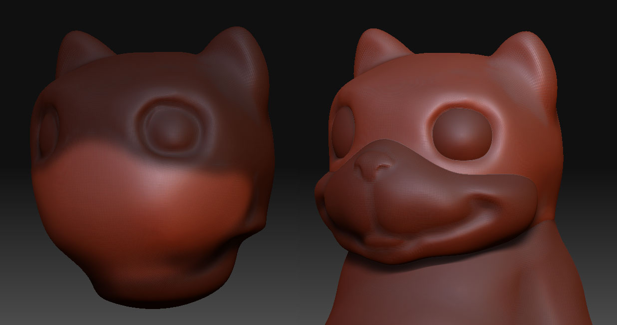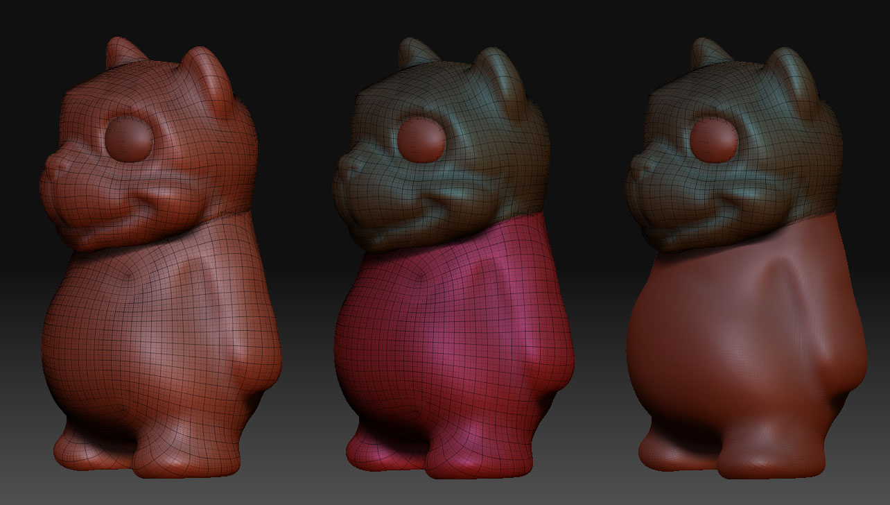 いい感じになって崩したくない部分が出来たらマスク掛けながらモデリング 時々背景にオブジェクトが埋もれてしまうことがありますが、そんな時は 一旦Editモード解除して、Moveをオン、どこでもいいので画面をドラッグで浮き上がってくるです ある程度顔が出来たら、体用にPolySphereをアペンドして、体をモリモリ造形 首の繋がりを滑らかにしたい場合、同一のツール内に複数のオブジェクトが入っていないと纏めて弄れないので、ある程度段差を無くしたところで、纏めたいオブジェクトのSDivを統一しCloneを押して、Tool->Geometry->InsertMesh これでフラットンブラシとかで首の繋がりを撫でてやればこんな感じに馴染んでくれる 終わったら別々のオブジェクトに戻してもよし しかし、このままGrpSplitを押しても元には戻らないのであった フレーム表示すると一つのグループに纏まっているのが分かる Tool->Polygroups->Auto Grouosを押してグループ分けしてから、Tool->SubTool->GrpSplitを押すと、それぞれ別のサブツールに分かれたことが分かる クローンしたパーツをアペンドしてマスク掛けて撫でて、パーツごとに精度を高めたり 色々試してみよう なんかメタセコで作ったみたいになっちったw