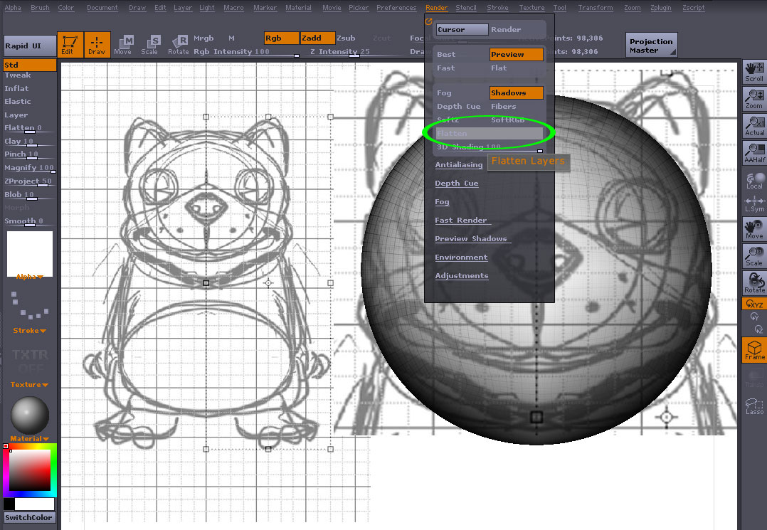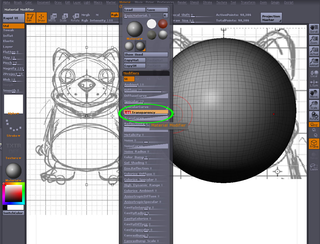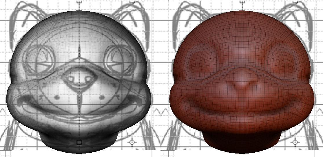 下絵を展開してもオブジェクトが透けてくれないと意味がない マテリアルをBasicMaterialに変更し、Material->Modiriers->Transparensyを0→100に ※これは透過率に当たるそうです Render->Flattenをオフに これでオブジェクトが透けて見えるはずです マテリアルを見やすいレッドワックスなんかに時々交換しながら下絵に合わせて グリグリグリ これでなんとなく下絵に合った形になる筈です