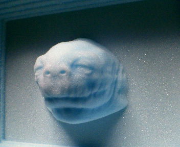 高さ3cm 仕上げのミルは1mmの角刃 さすがにここまで細かくなって来ると針みたいに尖がった特殊なミルが必要みたい・・・・・・・・・(目玉も彫れてない) 素材もワックスが良さそうかな? 細かいシワなんてワックスなら後で針で引っかいてやれば直ぐ付くしw