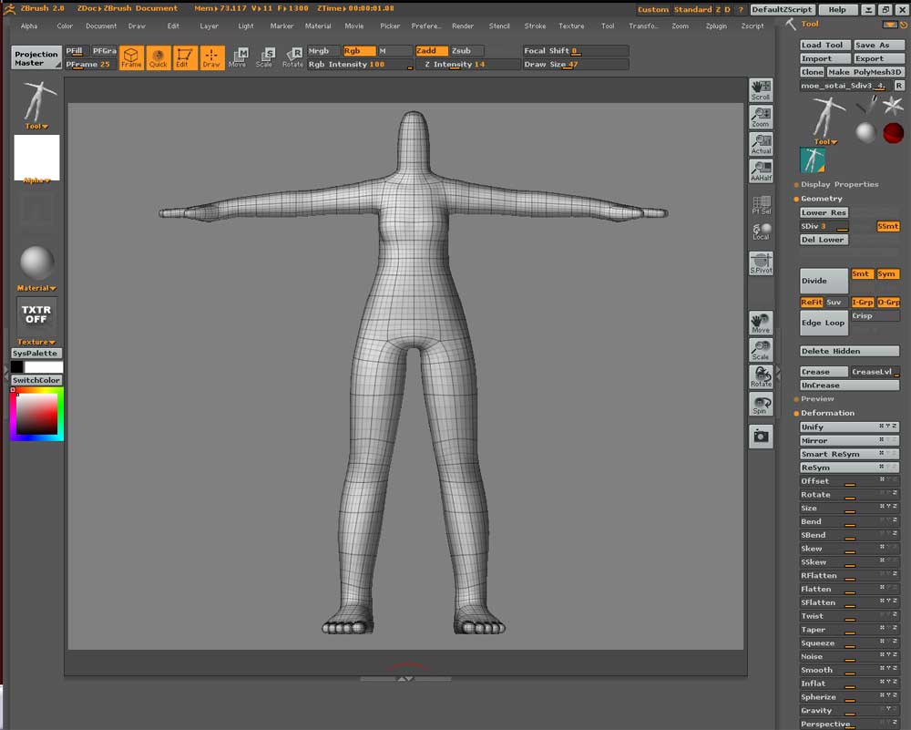 Tool→Geometry→Devide 1回クリックしてSDiv2にし、Move等で大まかな流れを弄る 更にもう1回DevideしてSDiv3にしたらブラシでSmooth掛けたり、Z Intensityを10~15程度に下げ、わずかな凹凸が付く程度にして軽く彫刻したり、最終仕上げのつもりで丁寧にやる ふっくらさせる為に最後にDeformation→Inflat を全体的に適用してみますた(便利な機能だけど指の間とかもすぐに埋まってしまうので気をつけようw)
