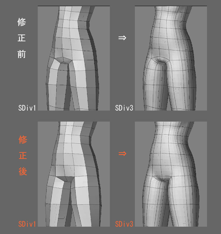Devideした後もローポリのデータも残っているので、簡単に戻って編集することが出来ます 詳しくはこちらw http://www.oakcorp.net/zbrush/mrme.shtml 股間の繋がりがおかしかったので、SDiv1に戻ってキュッと食い込ませました 今迄あんまり使ってなかった機能ですが、慣れると楽しいw
