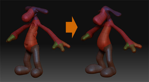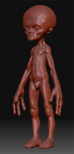 そんなわけで昨日の思い付きを試してみたら、なんとなく使えそうだったのでレポート 先程のZSphereですが、ポーズが後で修正するのにめんどうだったので、こんな感じに耳まで開いてMake Adaptive Skin あんど Make Unified Skin こんな感じのが出来るので、同一サブツール内に収めます アダプティブスキンが上ね ※アダプティブスキンの頂点の重なりとかはスムースかけてほぐしてます 両方とも可視状態にして、ProjectAllを押すと、二つのいい所が一つにまとまるんだ でも形状のズレが大きかったので右のようにクレーターが出来た↓ スムースブラシをかけて、もう一回ProjectAllしたりして修正したら、更に気に入る所まで直す とりあえず出来た 時間も大して掛からない 全身リトポとかしたら2~3時間くらい掛かりそうだけど、切削ならこんなのでもいいかなぁ・・・・・・・・ 構造的には押出しで作ったのと変わらないし