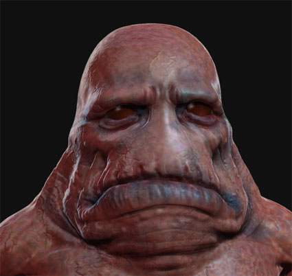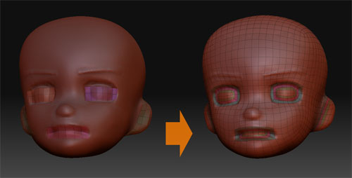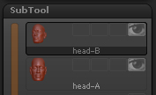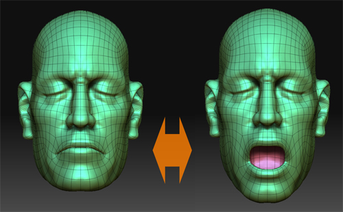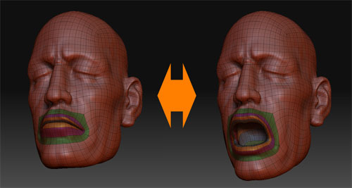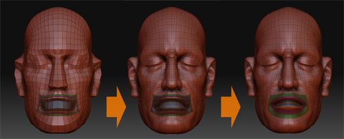 2日も何もしなくてごめんなさい しんでますた エッジループとかあんまり使ってなかったのですが、意外と便利だったので使い方とか 上の図はスフィアで作った顔の口の部分だけエッジループでポリゴンを追加した物です 口ぱくは3Dレイヤーです ZProjectブラシなんて便利すぎる機能が付いてるので色々できるようになりました 以下はやり方 最初に作った顔のcloneを作っておきましょう 元の形状を保存しておく為の物なので、同一のサブツール内にアペンドしておきます 後で使います スフィアで顔を作ったら、SDiv1の状態で、口の部分だけ表示させて、Geometry>Edge Loop 常に中心のグループだけ表示させながら数回繰り返すと真ん中の画像のようになります 口の周りが細かくなっていても使えないので、形状が潰れますがスムースブラシで均します その後でMoveブラシで口の開く形を考えながら正面から見た位置を調整したのが右側の画像です 最初に保存しておいた元の形状 この図ではhead-A なのですが、これを可視状態にして口の周辺が崩れてしまったエッジループを施したhead-BにZProjectブラシで写し取ります ZProjectブラシにはDragRectのストロークが良いですね FocalShift調節してぼかし気味に 綺麗に形状が復元されたら3Dレイヤーを新しくこさえます 動かしたいあごの部分以外にマスクをかけたらRotateに切り替え口を開きます この口の開閉は3Dレイヤーに記録されたので、この後はマスクを解除して、レイヤーのオンオフで操作すればOKです 口を開いたら内側にどんどん押し込んで行きます 作業しづらくなったら裏側から盛る形でも穴は凹んで行きます こんな感じ↓ とりあえずポリゴンが足りないけどリトポなんかめんどいぜって時に使えるんじゃないでしょうか がんばればスフィアを伸ばしながら全身作れそうな気もするけど・・・・・・・・・・・・・・・・・・・・