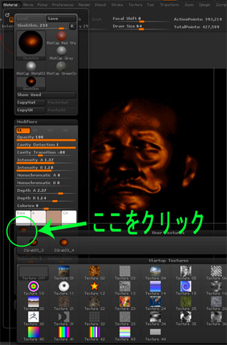 マテリアルの弄り方は、ここに書いてあるっぽいげ↓ http://www.zbrush.info/docs/index.php/MatCap_in_Action:_Capturing_Other_Materials ツールだったのね Toolパレットのスライダで探すと 16番 Current Tool (カレントツール)・・・・・・・・・現在のツール、ツールパレットの現在使用中の一番でかいやつ をクリックしてウィンドウ開いても見つけられるよ 下のほう マテリアルを画像として編集する場合はSphere3Dを使うようです まずディバイドして面を滑らかにして、黒バックにしたら、ツールをMRGBZGrabberに変更して、四角で囲うと どんだけでたらめに囲ってやっても欠けてさえいなければ、中心(?)にちょうどいい(?)大きさに切り取ってアルファとテクスチャを作ってくれるもよう アルファを作る方法は他にもあったような気がするけど、この方法でも作れるのね なんか分かりにくい所に色々便利な機能が隠れてるっぽいZBrush・・・・・・・・・・ でもあの説明だけだと分かりにくいような~