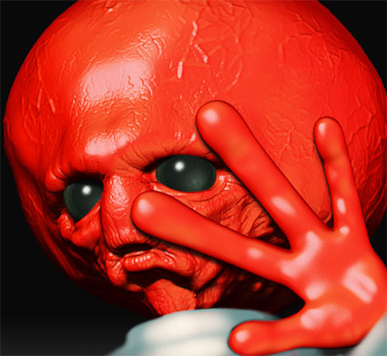 いきなり写真を撮られてびっくり宇宙人・・・・・・・・・・・・・ 吉井さんに色の重ね方教わってから楽しくて楽しくて♪ フィルタ>アーティスティック>塗料(ブラシの大きさ:5、シャープ:25)をオーバーレイ50%で重ねてます マテリアルは先日のトマトのです あとは宇宙服作って、指紋とか彫って、目玉ちゃんとしたの作って、シンメトリー過ぎるので崩して・・・・・・・・・・・ 色々やらねばねば
