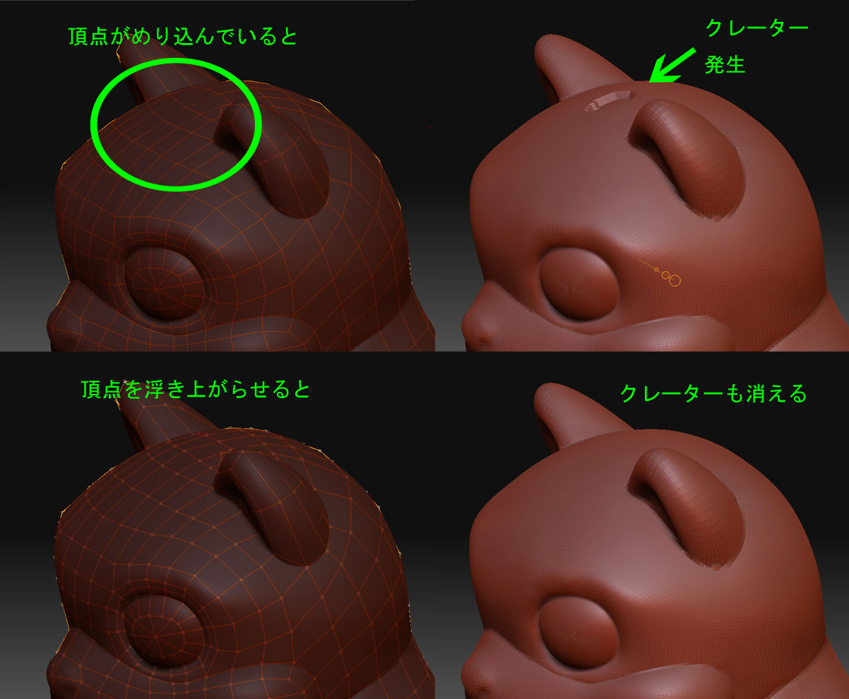 穴ができる部分のトポロジー頂点を少しベースの表面から放すように、Moveツールで移動させて修整しましょう