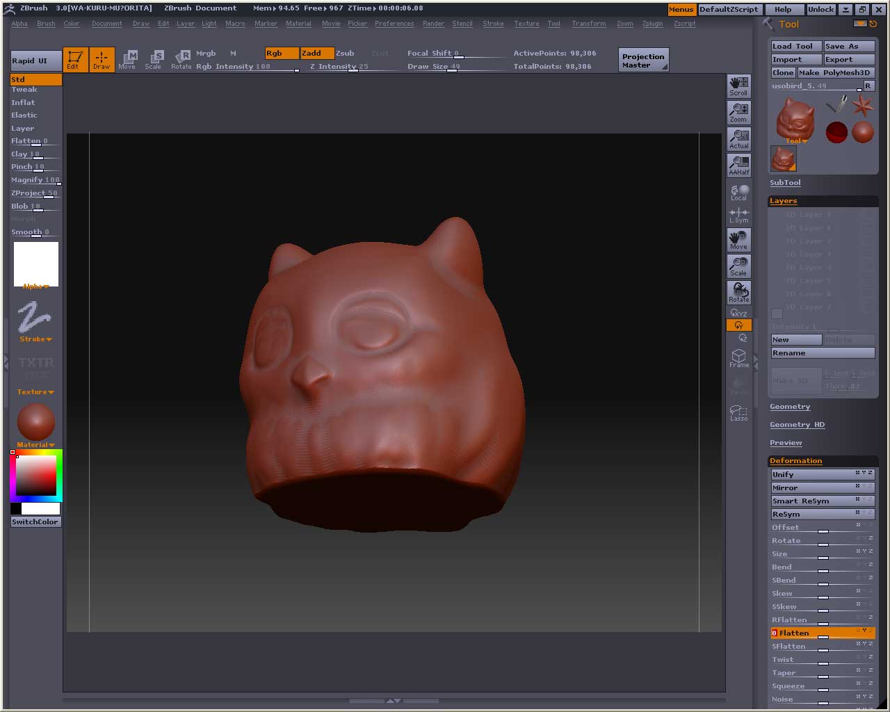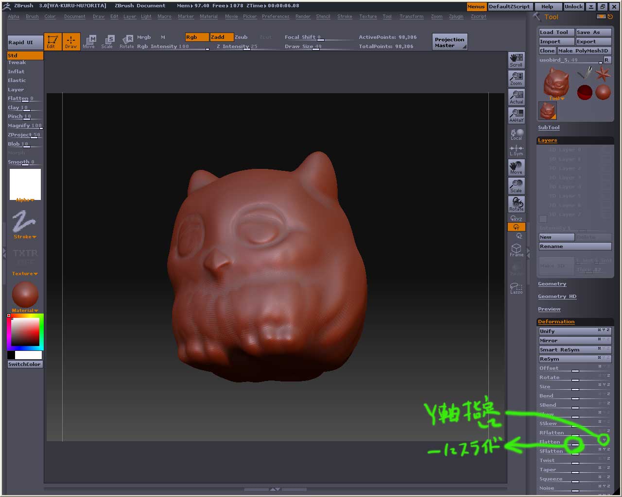 Online Videos by Veoh.com スタートボタンが表示されない場合はこちらからどうぞ http://www.veoh.com/videos/v6626435ewtm3cW 紹介したかった機能は、部分表示にして裏っ側から盛ると表側は凹むっていうことか ※この時Tool>Display Properties>Doubleボタンを押しておかないと両面表示にならないよ 半面だけ彫刻が進んじゃった時に、Smart ReSym で左右対称にするとか(あれ?マスクしなかったっけかな・・・・・・・・) ※コピーしたい側をマスクで囲っておかないと左右の平均化になっちゃうよ マスクを掛けてアルファでイボイボ作ると自然な流れで凹凸を作れるってこととか マスク掛けて反転(Tool>Masking>Inverseボタンをオン)させてTweakで引っ張ると、指がびよ~んって伸びることとかかなぁ(簡単に牙とか角とか作りたい場合はこれ使うことが多いですよ) それからSphererize(Tool>Deformation>Sphererize)ってのがまた面白くて、何回か適用させると風船みたいに膨れ上がったりしてw ここでは全体的に丸みを持たせる時に使ってます 最後に全体的にInflat(Tool>Deformation>Inflat)掛けました 動画でやった実験は、Auto Zoom を.50に設定してみました 作業している所に自動的にズームするみたい あとタイトルの画像をピクソに変えてみますたw しかし今日は暑かった・・・・・・・・・・ 何やってもさえないよぅ・・・・・・・・(いいわけ) 1時間半くらい掛かってるしこれ・・・・・・・・・・・・・・orz