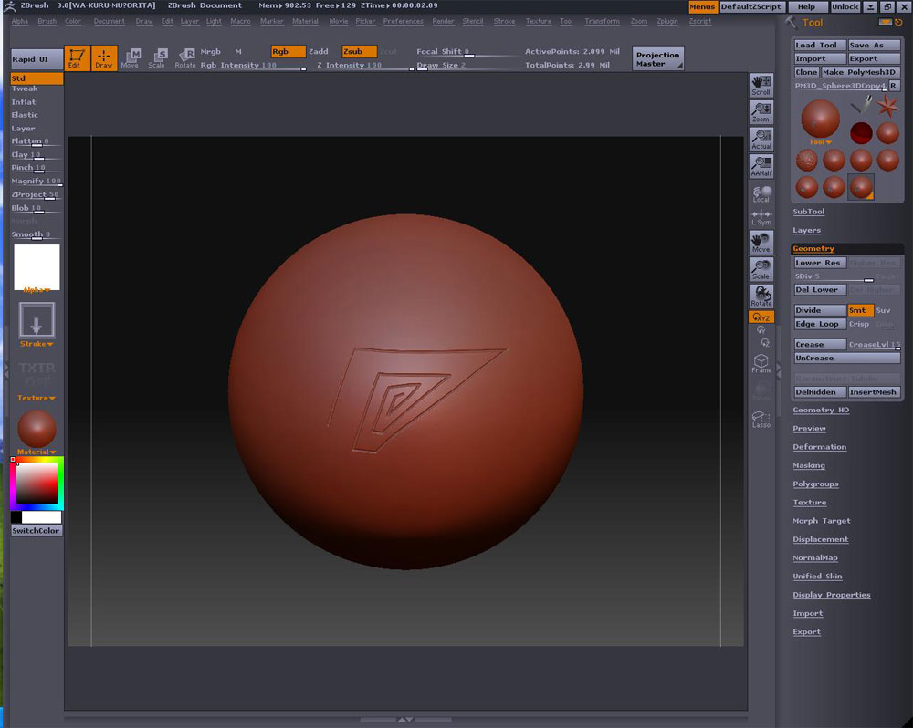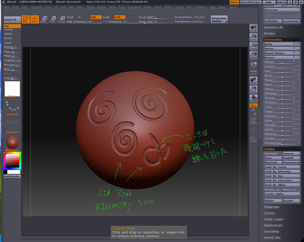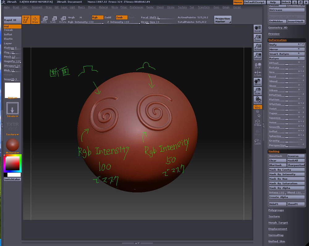 sige1111さんに教わったレイジーマウスを使って早速筋彫り実験w Stroke>LazyMouseボタンをオンにしてやると こんな感じに線が綺麗に引けます 尻尾みたいに伸びる赤い線の分戻してから線を引くと、こんな感じに鋭角も引けます 筋彫りを考えた時に、モールドを彫ってしまうと部分的な修正が利かないのと、深さにむらが出来ていそう マスクの場合は修正がしやすいのと後から追加しても綺麗にまとまる 何よりも全体的にInflatで均一な深さでモールドを入れられるのが良いとおもった という訳で更に実験 レイジーマウスのままCtrlを押して描線でマスクが引けますね この時、Rgb Intensity を100にしたものが左側 Rgb Intensity を50にしたものが右側になります(50にするとマスクの際にボカシが入るので結果の断面が丸くなります) これをInverseしてマスク反転、DeformationでInflatを100にしてみました 分かりやすく凸モールドにしてみましたが、Clearを押して一旦消しておいたマスクも、再度ViewMaskボタンを押すと復活するので、凹凸がない状態まで戻ってInflatで-100にしてやれば凹モールドになります 下の段に直接彫った物も比較用に並べてみましたが、マスクを使って凹ました筋彫りの方が綺麗に仕上がっているのが分かります 直接彫った場合、タッチの強弱が影響して深さや太さにむらが出来たりしてますね