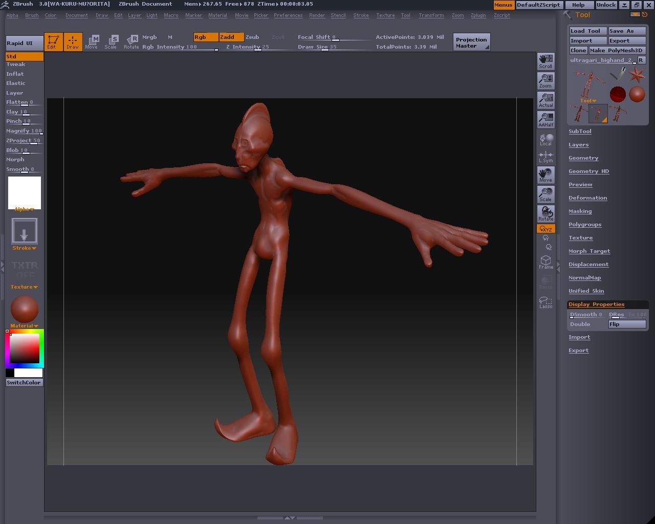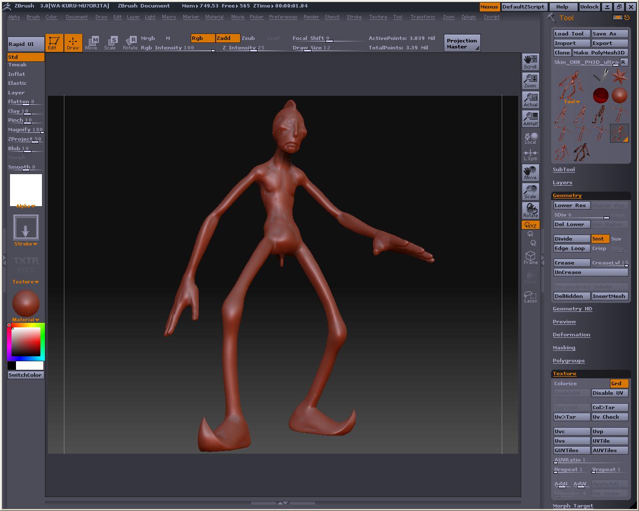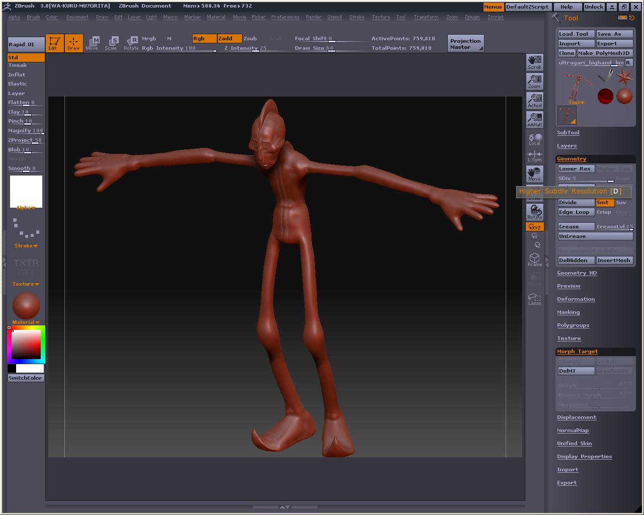 ばんちょさんのDevide・・・・・・・・・w これ凄いのでここで使わせて下さい! まずはローポリ状態で、Tool>MorphTarget で、StoreMTボタンをオン Devideを押し、SDiv5(細かくしたいところまででOK)まで細かくしたら、今度はLowerResを押して元のSDiv1(一番下)に戻す すると元に戻した筈なのにDevide前より微妙にやせちゃってるのね(きっとこういうのに気がついてない人って居るんじゃなかろうか?) そしたらSwitchボタンを押し、DelMT、そして再度StoreMT あれれ? ちょっと膨らむぞw 同じ工程を数回やるとこんな感じでローポリの時の力強さも残したままにDevideできる!! ばんちょさん、すばらしいテクニックをありがとうございます! ちなみにこちらがただDevideだけしたもの 比べるとこっちの方がよわっちいのね 詳しくは、こちらのHP 出力番長 ZBrush小技事典 http://www.k2.dion.ne.jp/~output/z/enc/encyclop.html 「10. ローポリの形状保持にモーフターゲット」に書いてありますよ~
