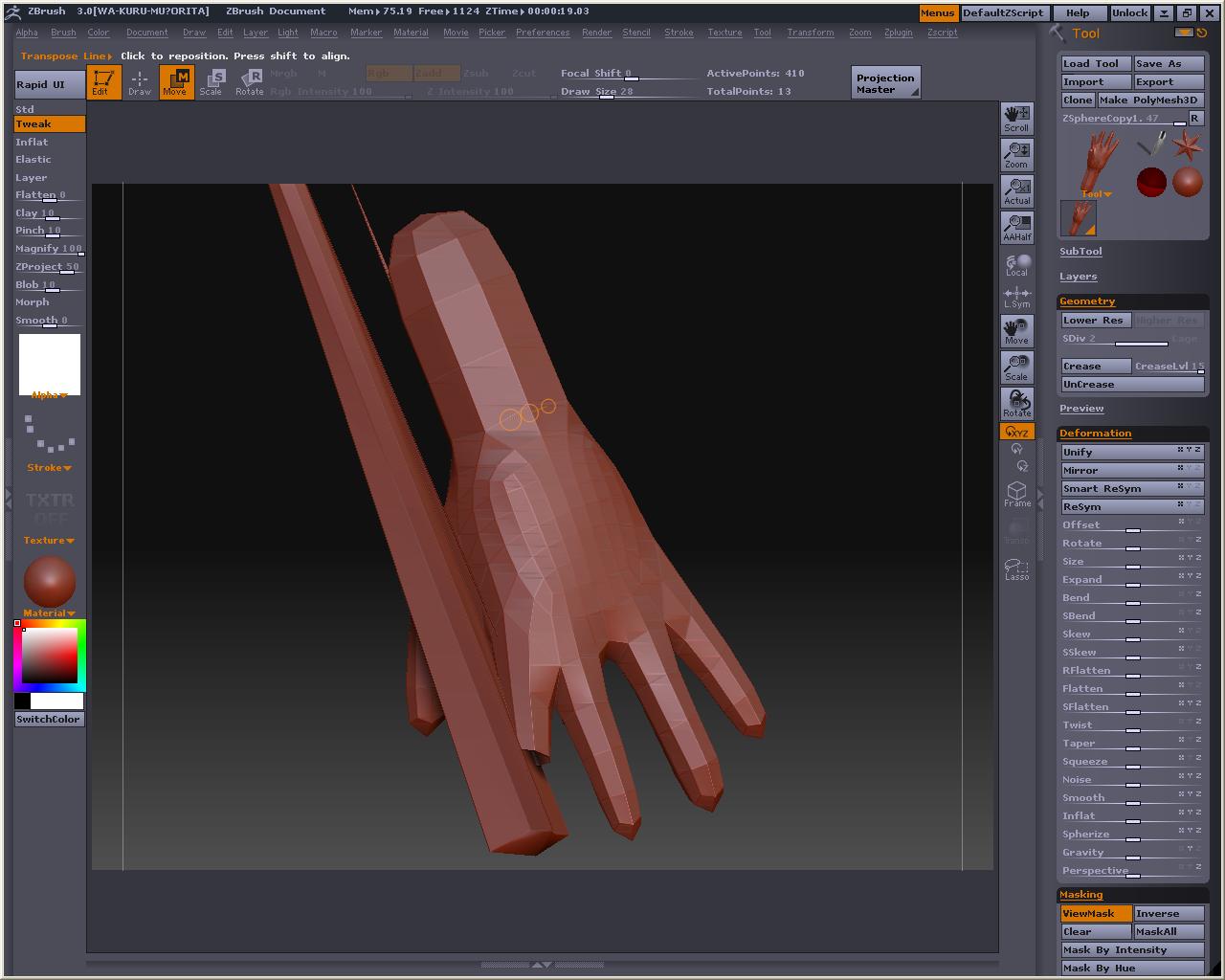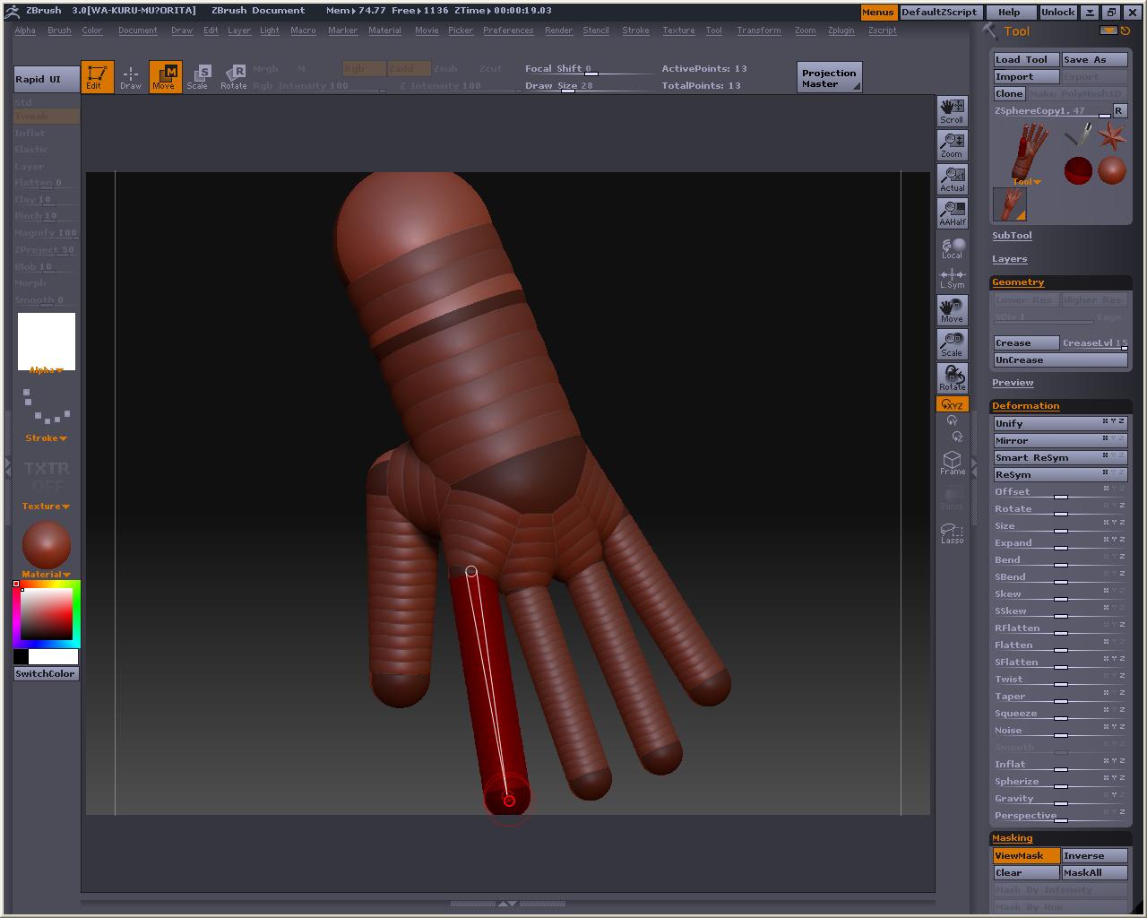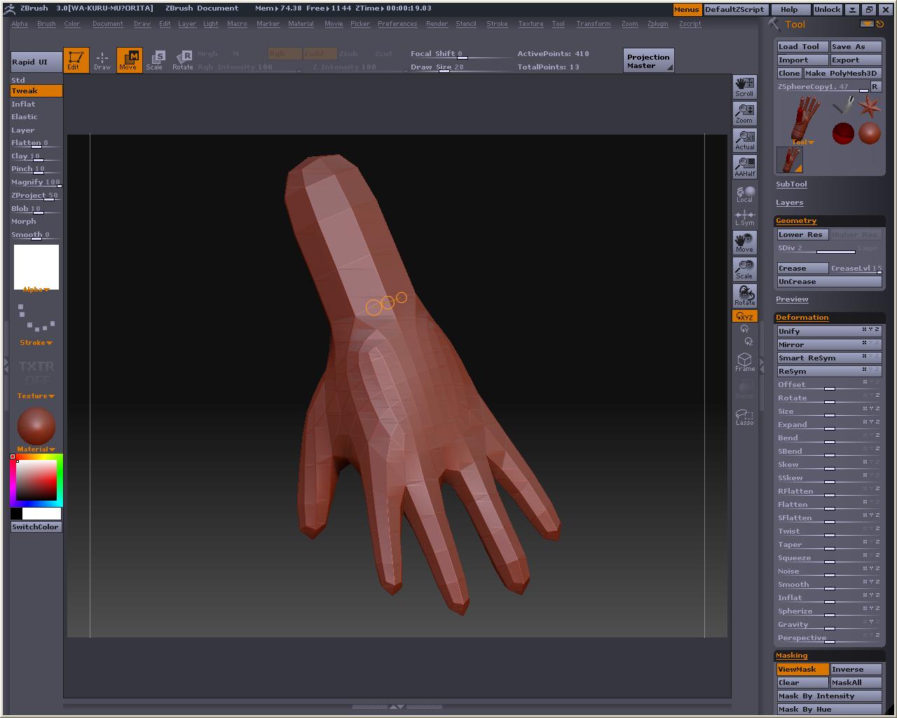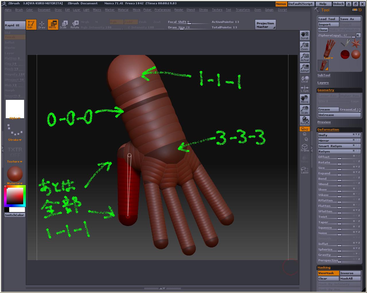 こうしないと手指のポリゴンの繋がりがおかしくなってしまうのはZ研掲示板でも話題になっていましたが、最初の一個目はやっぱり変更できないので、プラグイン(後から変更するやつ)が使えなくなった今、ZSphereはかなり使いにくいっぽい・・・・・・・・・・orz Z2残してる人はいいけどねw でもZ2使ってたような人達はあんまりZSphrereを頼りにしてないし・・・・・・・・・orz 子スフィア描く前に、Transform内に出来るXres、Yres、Zresの値を変更してやって下さい(どれか一つ変えれば全部同じになるようになってます) A押すとプレビューね これはちょっといじった後(指の繋がりがとってもやだ・・・・・・・・・・) とりあえず人差し指短いぢゃん・・・・・・・ってことで、もっかいAを押してプレビュー解除 人差し指の先端のスフィアを引っ張って長さ調整 そしてまたA押してプレビュー すると・・・・・・・・・・ やっぱだめかぁ~ Z2でもZSphere使って形を作ったものをいじるとこんな感じになったと思う(大きな変化はだめらしい) MakeAdaptiveSkin押してやるまであんまり弄らない方がいいね という訳で、もうめんどくさいからメタセコで作ったローポリの手をインポートした方が早そうですが、あえて実験 プラグイン無しでまともな手を作ってみようの巻