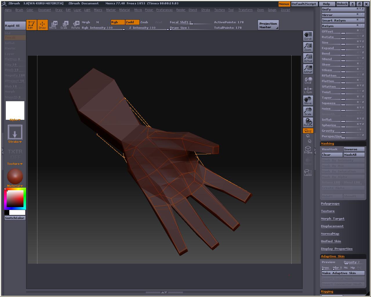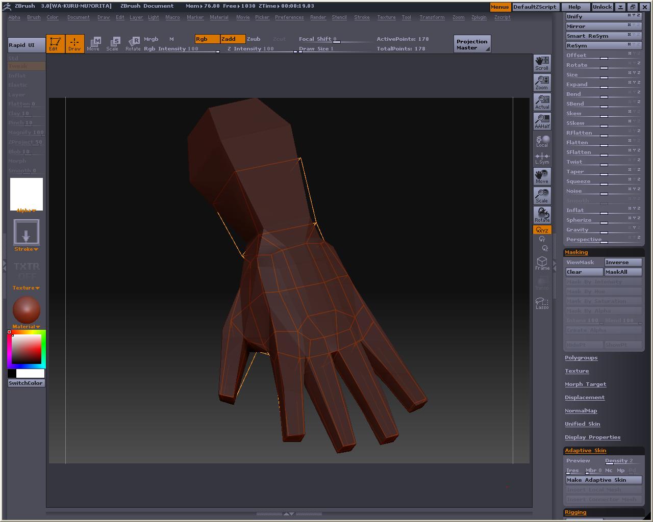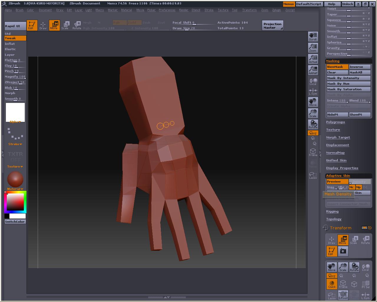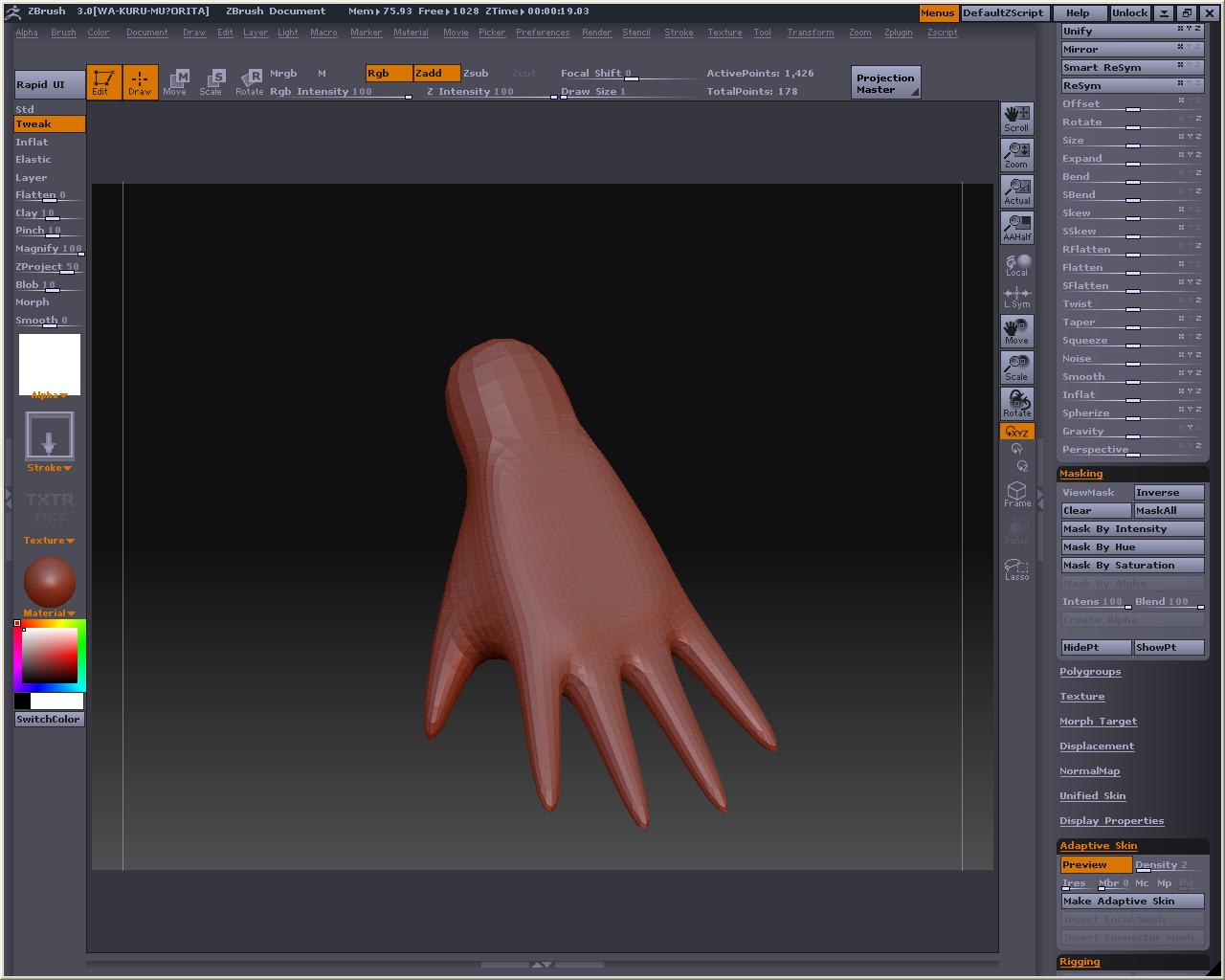 先程の手のMeshDensityを1にしてやります、プレビューするとこんな感じ とても耐えられないので、Tweakとか使って直せるところは直して、MakeAdaptiveSkin ※Shift押しながらドラッグすると部分的にSmooth掛かるので、これでなでると手の甲や掌は直ぐに平らくなります スキンの方を選択したら、もうおかしなことにはならないので、こっちを弄ります そしてこんな感じでトポロジ~(飛ばしてごめんなたい) 裏側 Aでプレビュー なんかカッパみたいだけど気にしないもんね Make Adaptive Skin を押してスキンにしたら、Tool>Deformationの中にあるメニュー弄って全体的に膨らましたりスムージングかけたりするです ここでは最初にInflatを2回くらいかけてふっくらさせ、ブラシで整えた後、Smoothを全体に適用しました 指の間のポリゴンの流れが怪しいですが、気になったらトポロジーで直すとか、メタセコにローポリで持って行って弄るとかすると良いのかもしれない おいらはこの状態でメタセコに持ってって他の素体にくっつけて使おうかなと・・・・・・・・・ Devideするとこんな感じ Reconstruct subdivを使って逆Devideみたいなことをしたら、Devideしても元の形状に近いものになるローポリが出来ないかテストもしてみた しかしこうなる・・・・・・・・・・・orz ローポリでメタセコに持って行って、部品を纏めて、ZBrushに戻してDevideしたら作ったままの形で色々合体遊びが出来ると思ったのですが、そう上手くは行かないか・・・・・・・・・