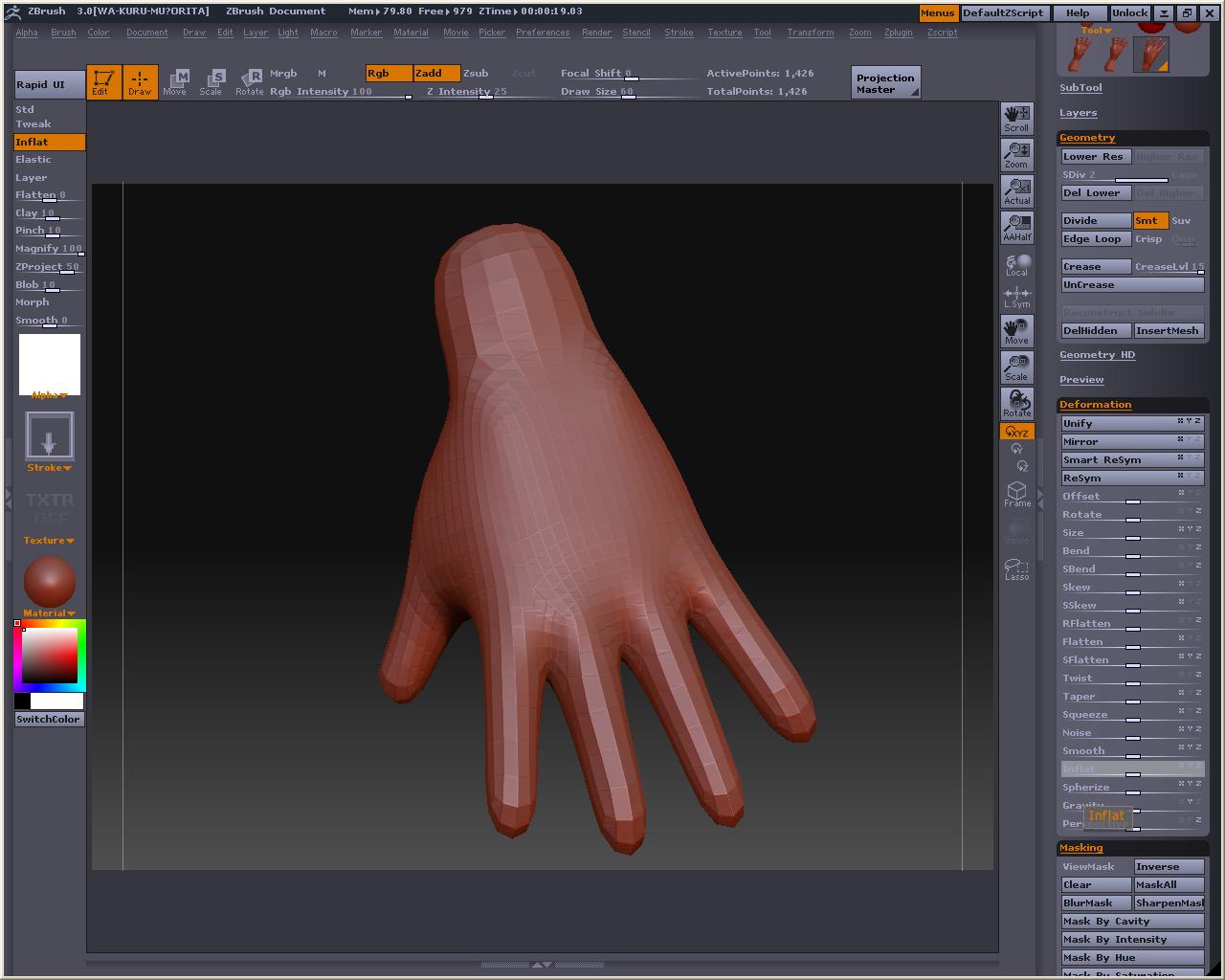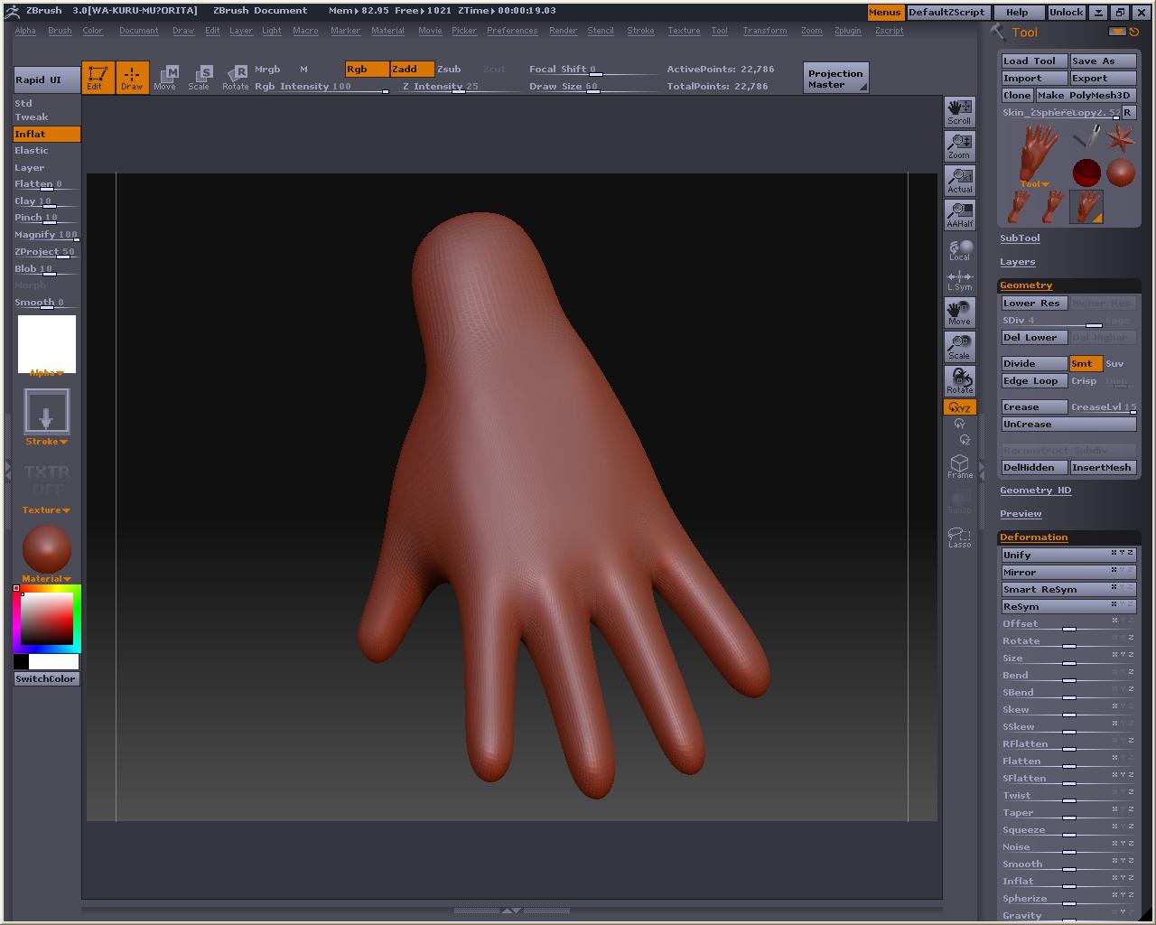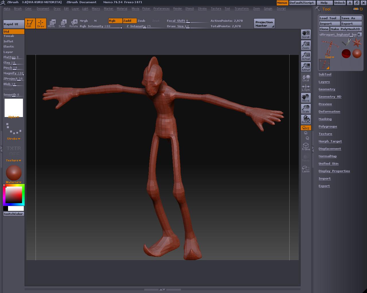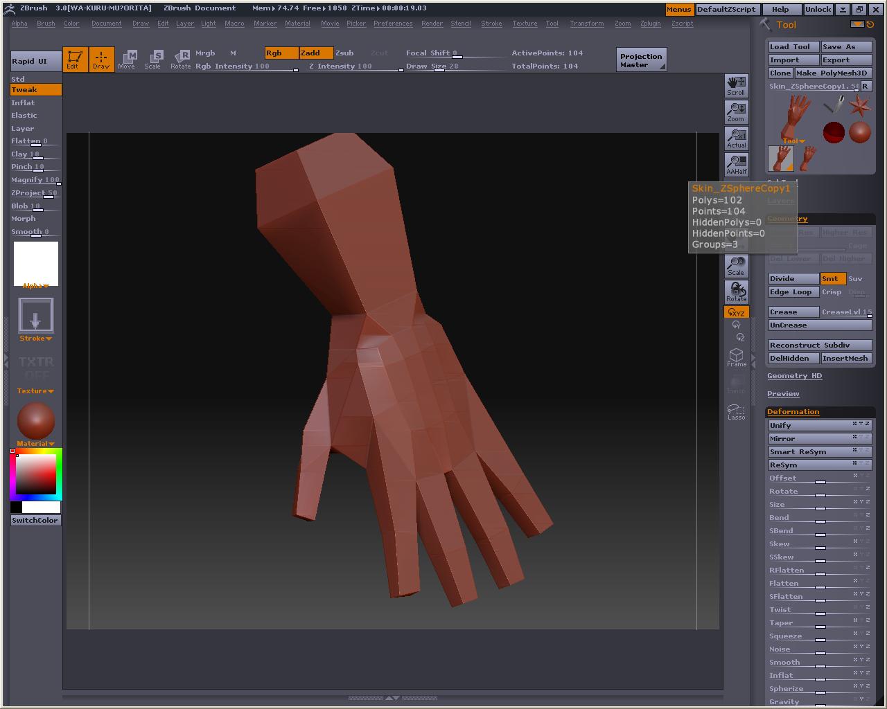 先程の手のMeshDensityを1にしてやります、プレビューするとこんな感じ とても耐えられないので、Tweakとか使って直せるところは直して、MakeAdaptiveSkin ※Shift押しながらドラッグすると部分的にSmooth掛かるので、これでなでると手の甲や掌は直ぐに平らくなります スキンの方を選択したら、もうおかしなことにはならないので、こっちを弄ります そしてこんな感じでトポロジ~(飛ばしてごめんなたい) 裏側 Aでプレビュー なんかカッパみたいだけど気にしないもんね Make Adaptive Skin を押してスキンにしたら、Tool>Deformationの中にあるメニュー弄って全体的に膨らましたりスムージングかけたりするです ここでは最初にInflatを2回くらいかけてふっくらさせ、ブラシで整えた後、Smoothを全体に適用しました 指の間のポリゴンの流れが怪しいですが、気になったらトポロジーで直すとか、メタセコにローポリで持って行って弄るとかすると良いのかもしれない おいらはこの状態でメタセコに持ってって他の素体にくっつけて使おうかなと・・・・・・・・・ Devideするとこんな感じ Reconstruct subdivを使って逆Devideみたいなことをしたら、Devideしても元の形状に近いものになるローポリが出来ないかテストもしてみた しかしこうなる・・・・・・・・・・・orz ローポリでメタセコに持って行って、部品を纏めて、ZBrushに戻してDevideしたら作ったままの形で色々合体遊びが出来ると思ったのですが、そう上手くは行かないか・・・・・・・・・