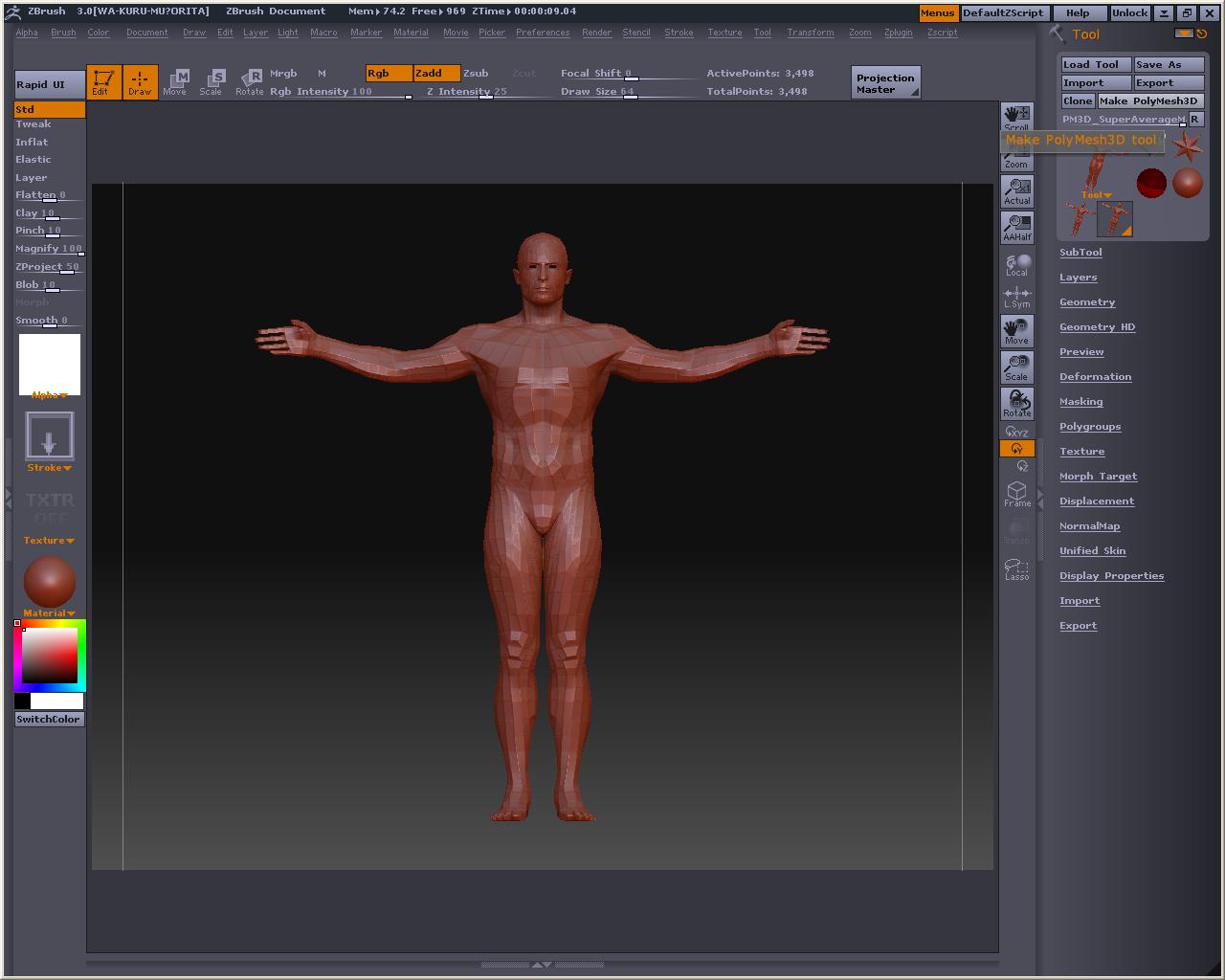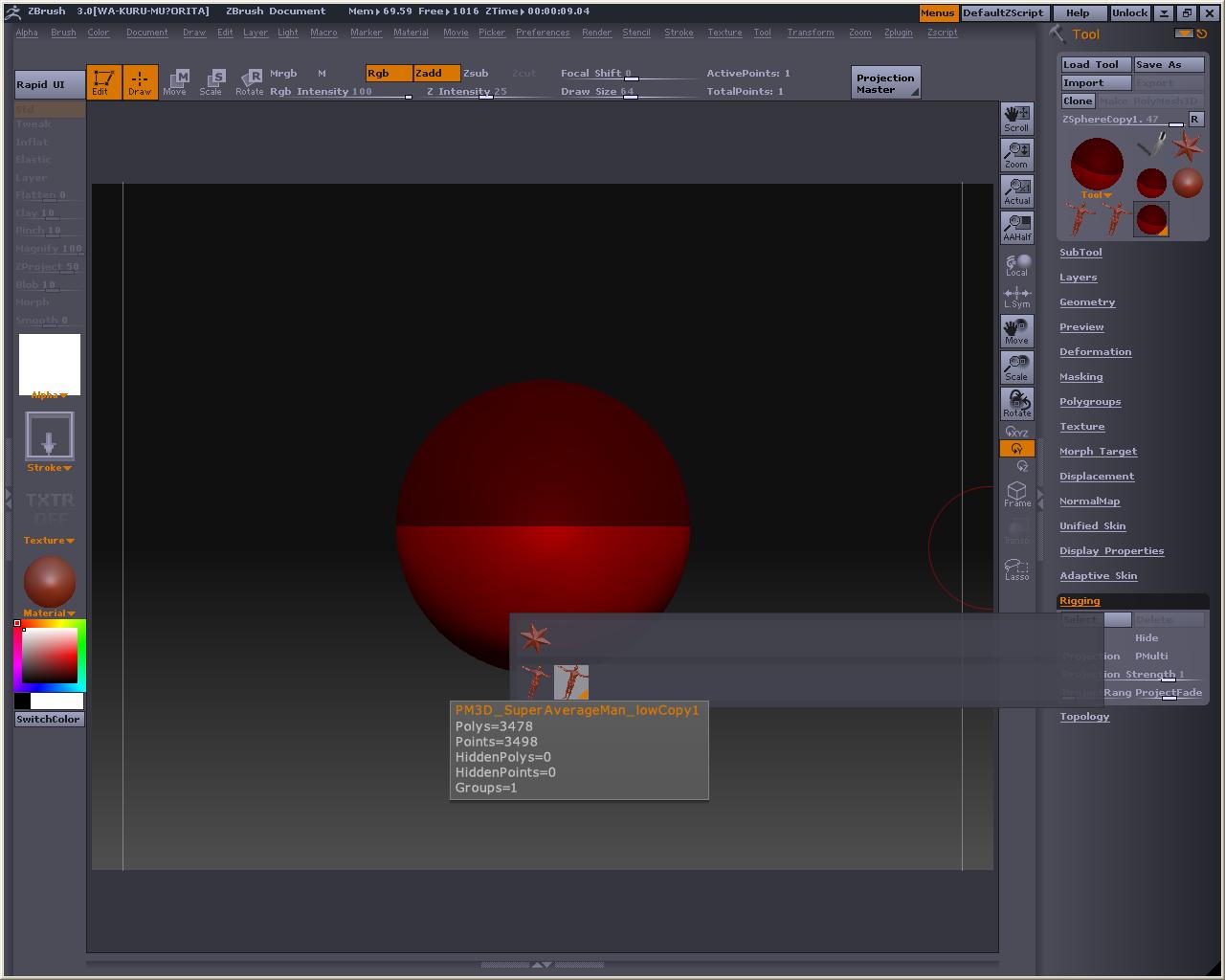 とりあえず無難にアベくん(Super AverageMan)を使って進めて行きまそう 起動画面で選択して まずはアベくんのポリメッシュを作っておくです Make PolyMesh3D ボタンを押してPolyMeshを作ろう 出来たら突然ですが、さっきの作業は忘れて、ZSphereを描きまそう アベくんは消えちゃったけど、今からまた出てくるから気にしないでねw Rigging>Select で、アベくんのポリメッシュ(PM3D_SuperAverageMan_lowCopy1)を選択しよう するとこうなる