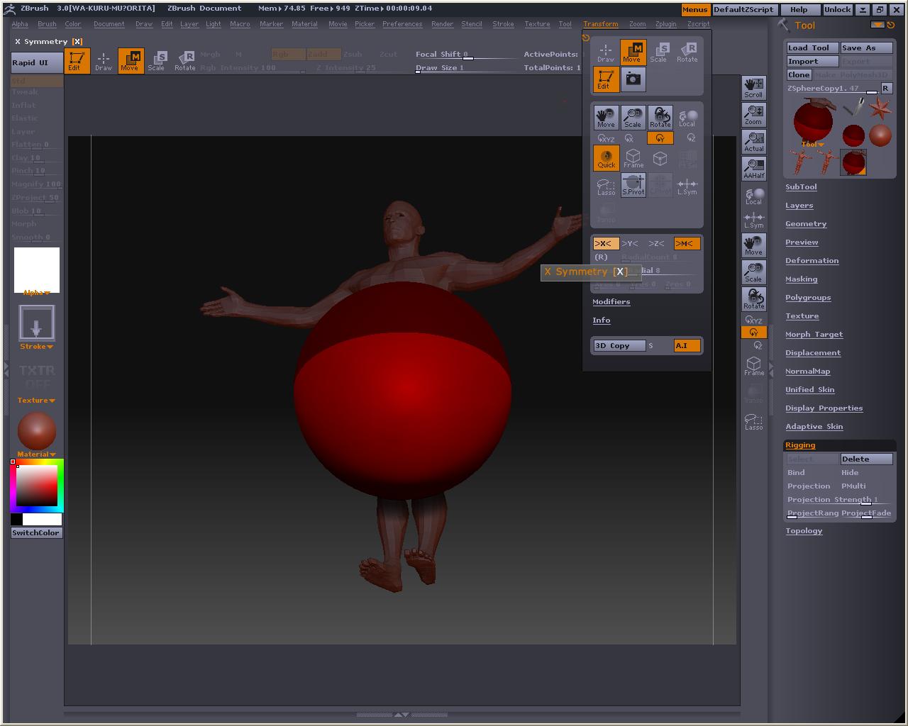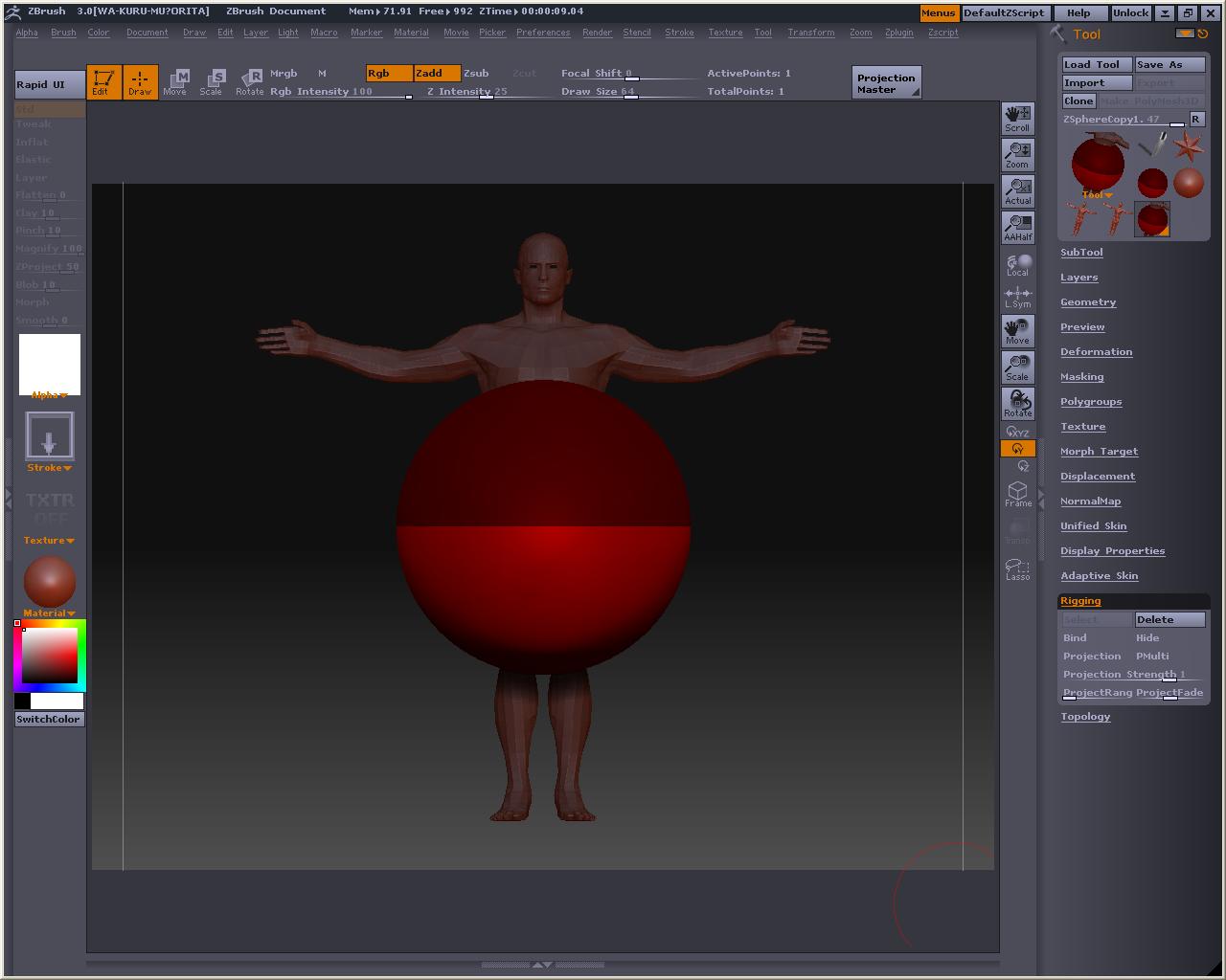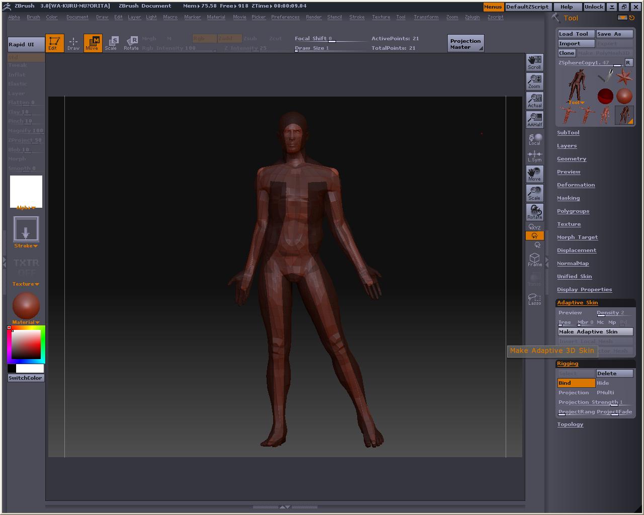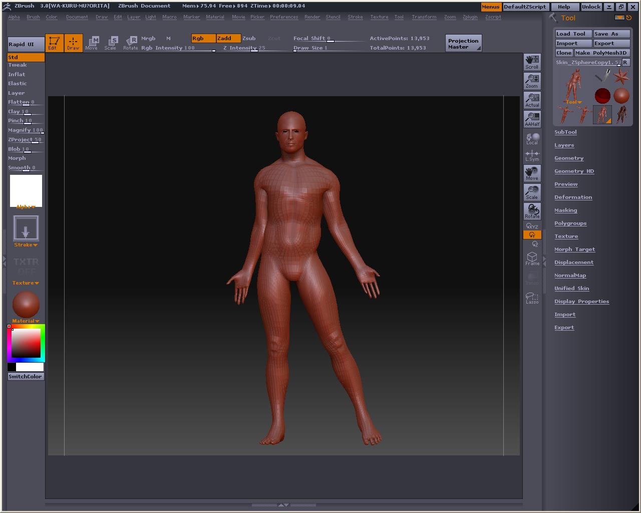 でか! 視点を変えても玉コロは重なっているので、アベくんに合わせてZSphereを配置して行きまそう この時、X軸でシンメトリーにしておくと左右対称と中心軸がきっちりしたものが作れます とりあえずこんな感じかなぁ? Bendってボタンを押すとこうなる 自由に弄ってみまそう Altを押しながらリンクスフィアの部分を引っ張ると、スフィア間の距離が保たれたまま変形が出来るので、ちょっとボーンっぽいです とりあえずシンメトリーを解除してポージング 落ちると台無しになるのでこれくらいで勘弁してくらはいw Tool > Adaptive Skin > Make Adaptive Skin ボタンを押すと でけたぽ でも腰が変だからこういうのを毎回修正してあげないといけないのかなぁ・・・・・・・・ アニメーションには向いてないよね オークの人とも話したけど、あくまでも変形の補助と考えた方がいいみたい