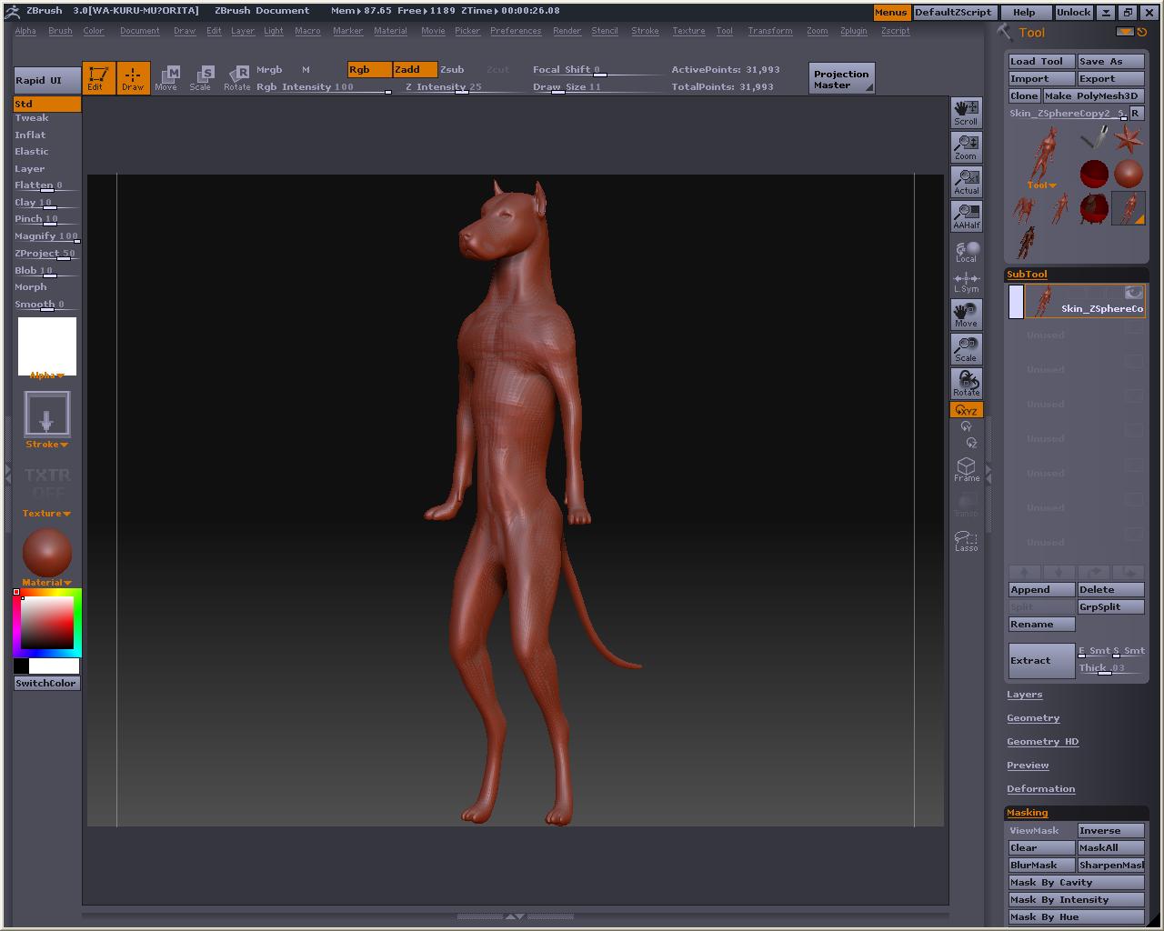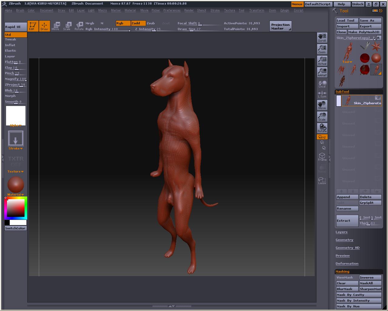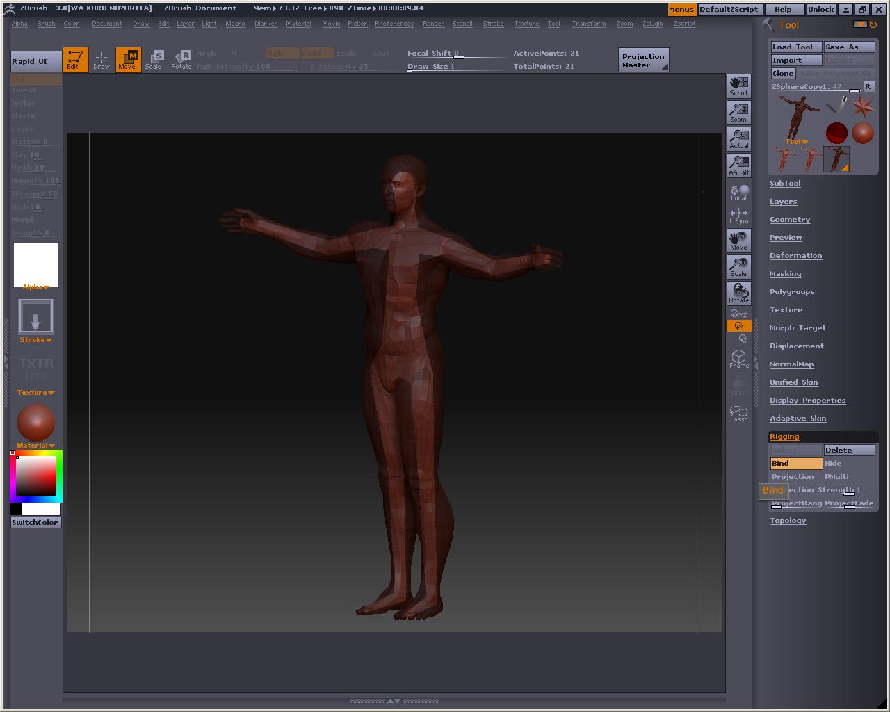 でか! 視点を変えても玉コロは重なっているので、アベくんに合わせてZSphereを配置して行きまそう この時、X軸でシンメトリーにしておくと左右対称と中心軸がきっちりしたものが作れます とりあえずこんな感じかなぁ? Bendってボタンを押すとこうなる 自由に弄ってみまそう Altを押しながらリンクスフィアの部分を引っ張ると、スフィア間の距離が保たれたまま変形が出来るので、ちょっとボーンっぽいです とりあえずシンメトリーを解除してポージング 落ちると台無しになるのでこれくらいで勘弁してくらはいw Tool > Adaptive Skin > Make Adaptive Skin ボタンを押すと でけたぽ でも腰が変だからこういうのを毎回修正してあげないといけないのかなぁ・・・・・・・・ アニメーションには向いてないよね オークの人とも話したけど、あくまでも変形の補助と考えた方がいいみたい