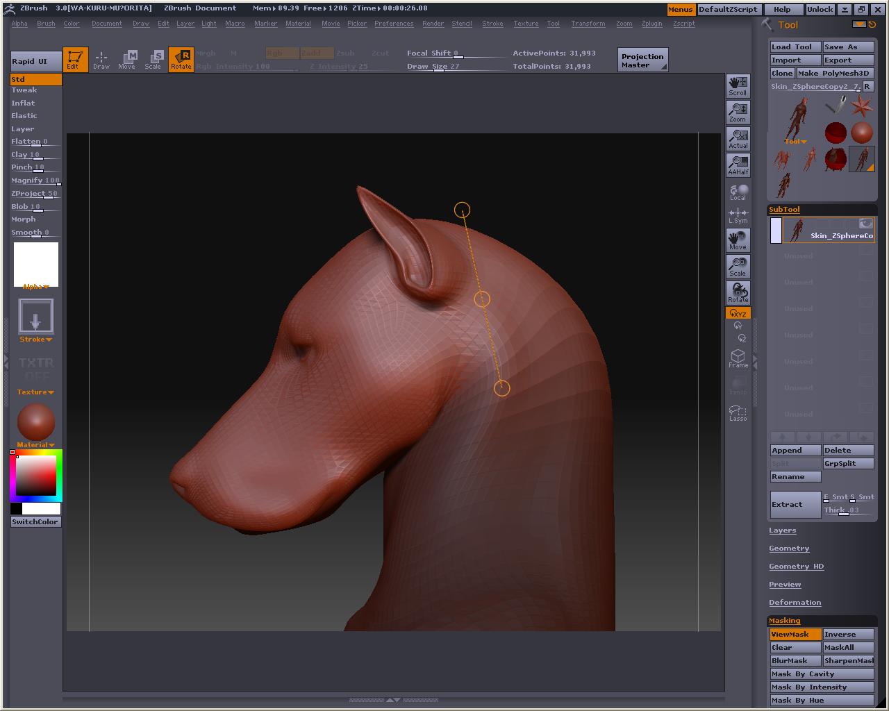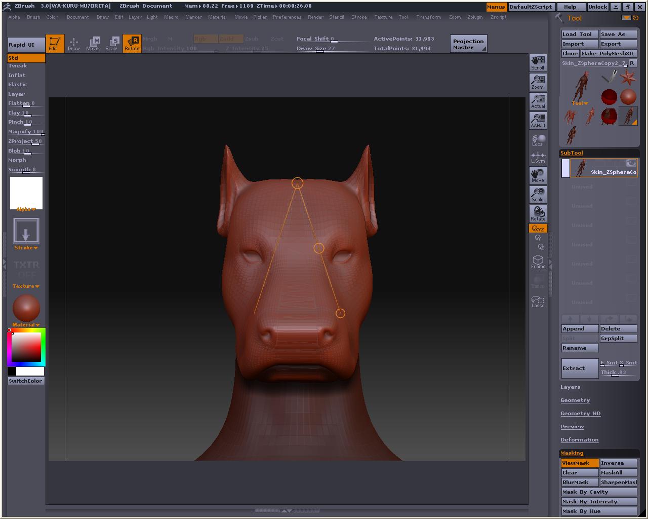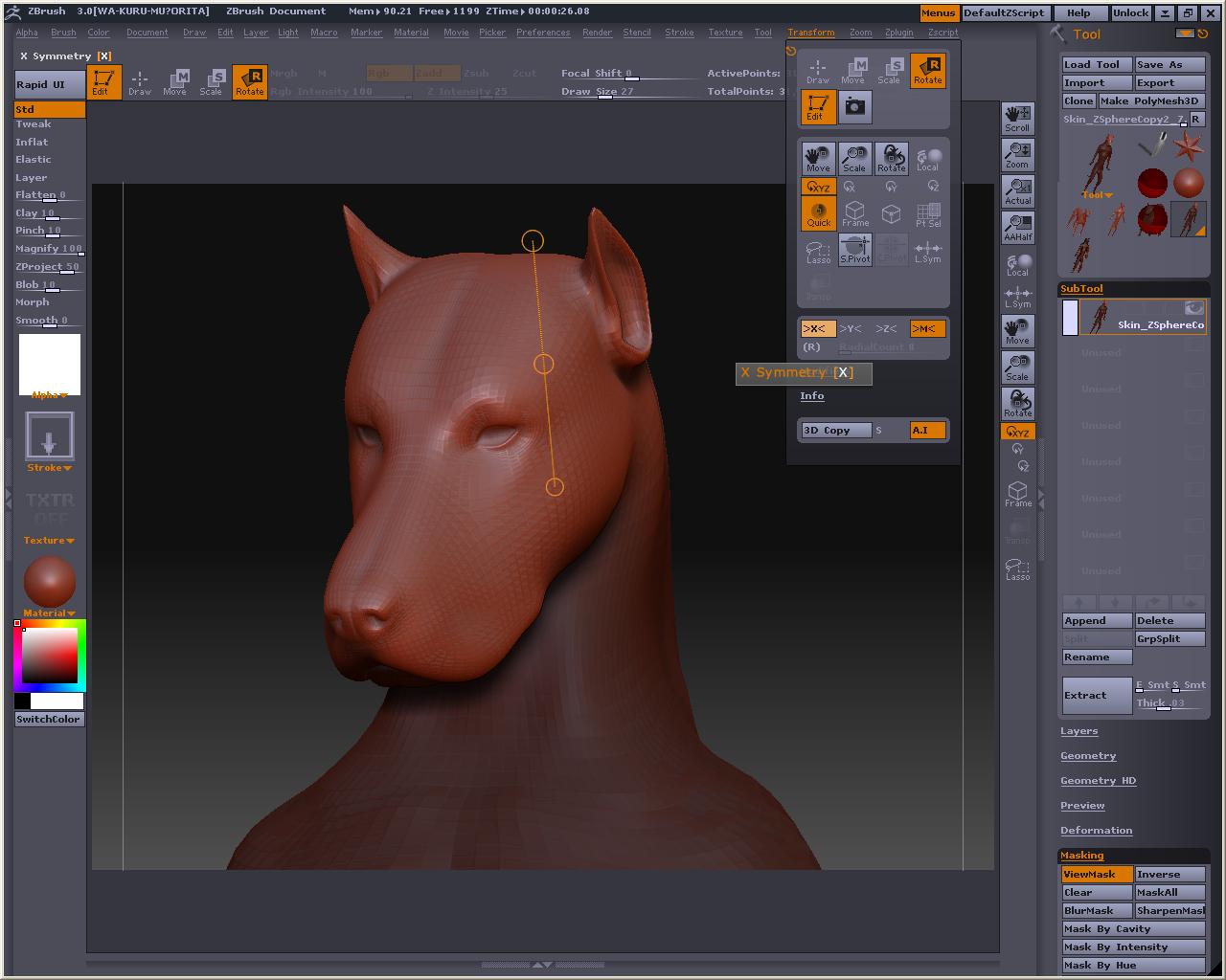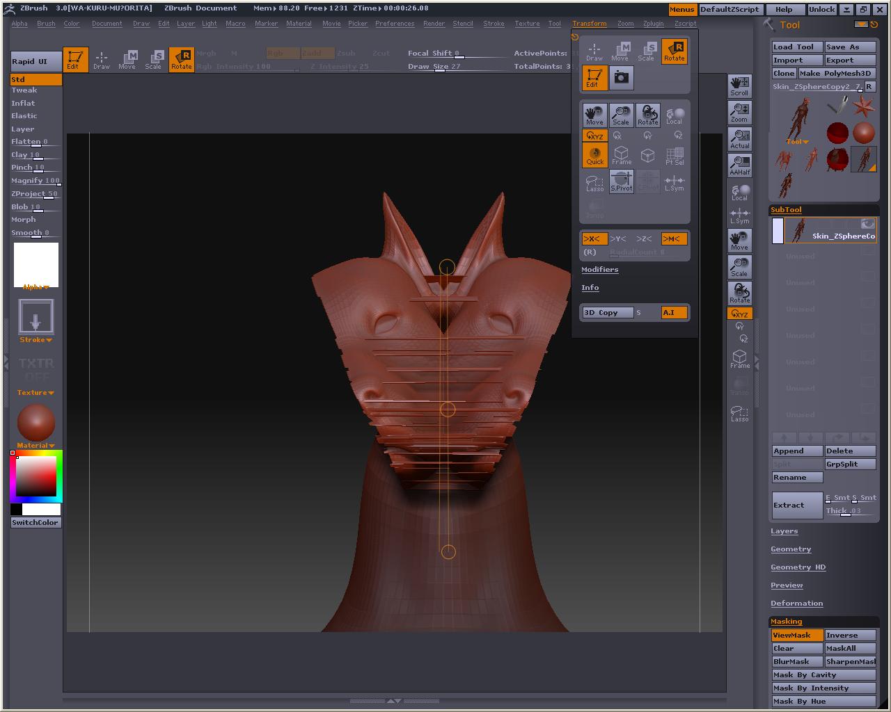 でか! 視点を変えても玉コロは重なっているので、アベくんに合わせてZSphereを配置して行きまそう この時、X軸でシンメトリーにしておくと左右対称と中心軸がきっちりしたものが作れます とりあえずこんな感じかなぁ? Bendってボタンを押すとこうなる 自由に弄ってみまそう Altを押しながらリンクスフィアの部分を引っ張ると、スフィア間の距離が保たれたまま変形が出来るので、ちょっとボーンっぽいです とりあえずシンメトリーを解除してポージング 落ちると台無しになるのでこれくらいで勘弁してくらはいw Tool > Adaptive Skin > Make Adaptive Skin ボタンを押すと でけたぽ でも腰が変だからこういうのを毎回修正してあげないといけないのかなぁ・・・・・・・・ アニメーションには向いてないよね オークの人とも話したけど、あくまでも変形の補助と考えた方がいいみたい