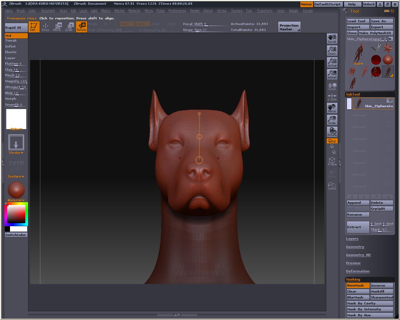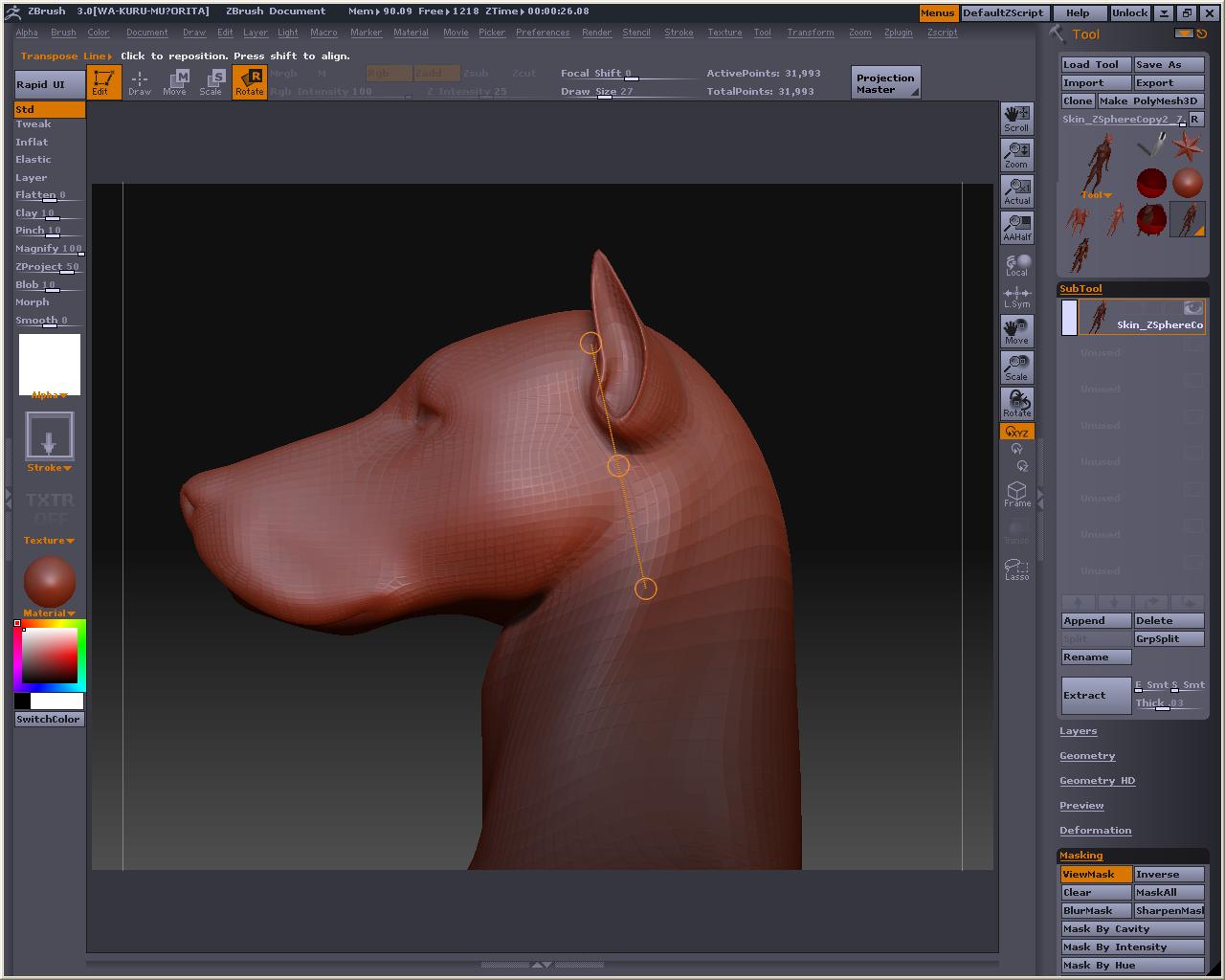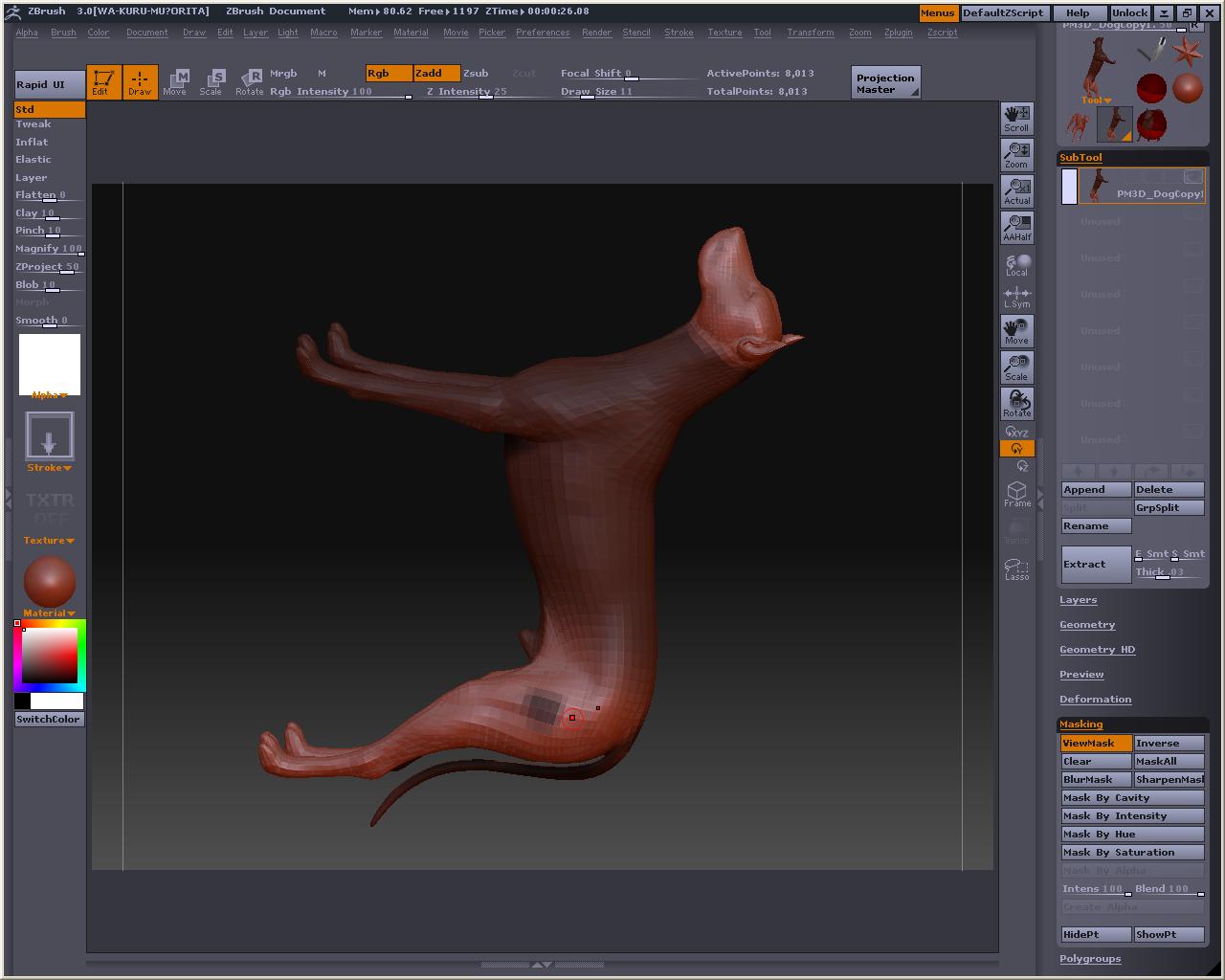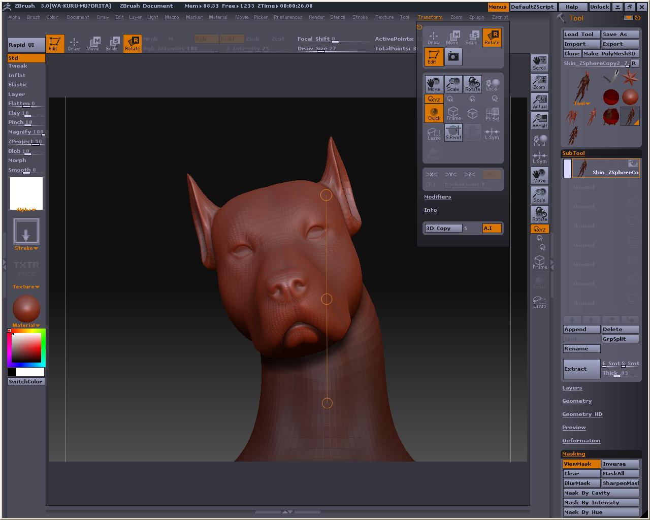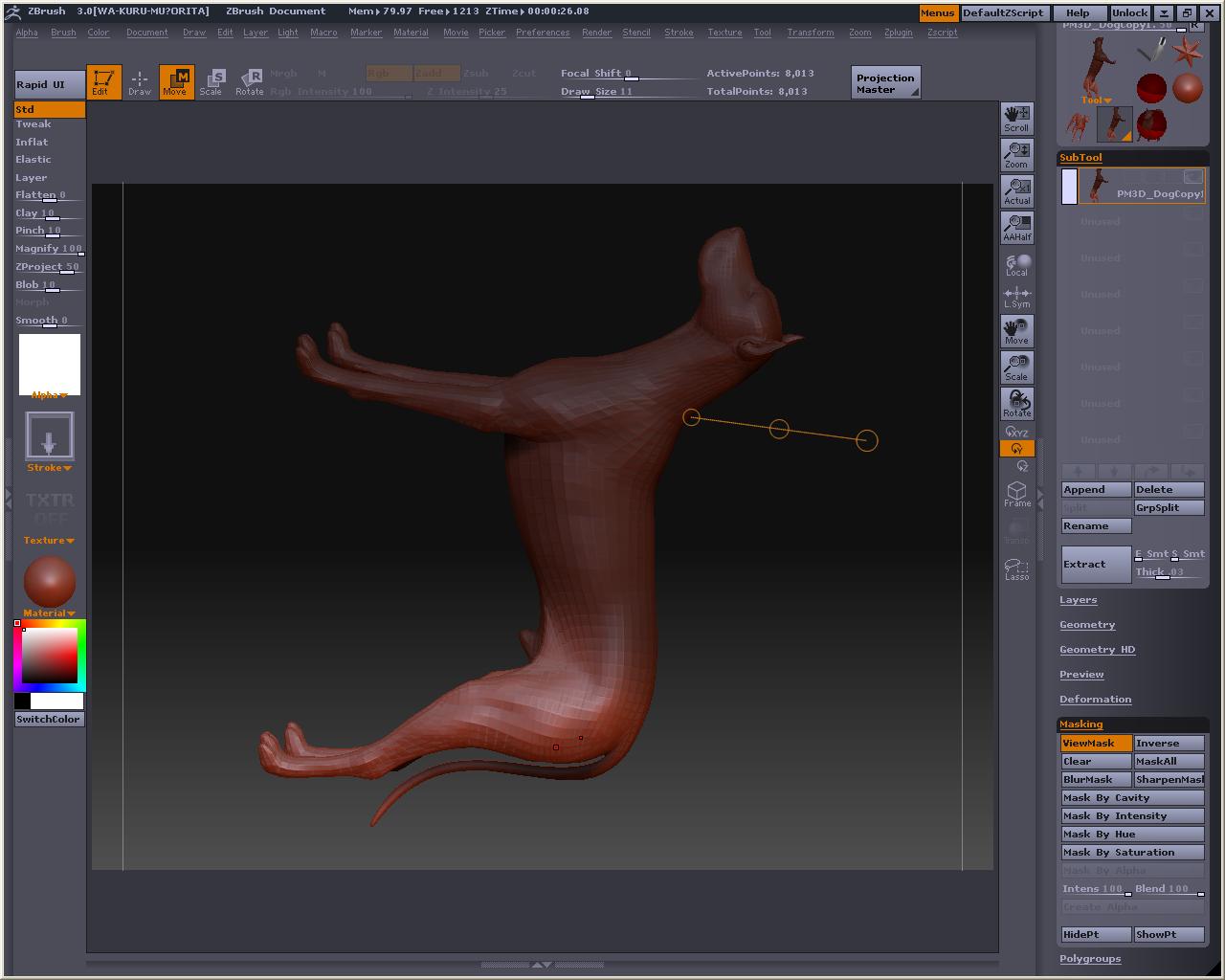 ばんちょさんのHPでも紹介済みでしたが、おいらよく分かってなかったみたい・・・・・orz 画像のようにトランスポーズモード(MOVE)でオブジェクトの上でCtrl+左クリックでドラッグすると、左クリックした所からハンドルが出現して一緒にマスクも一緒にビヨ~ンって付いてきます これが適度にぼけてて上手く間接に掛かるようにマスキングしやすいので、これを使ってポージングした方が良いのかもしれない ドローモードに戻ってマスクを足したり、ALt+Ctrlドラッグでマスクを部分的に消したりとかも出来るです そんな機能を使って起動画面の犬を直立させる実験w 手足や胴の長さなんかはリグを使って伸縮させて好みのバランスにしてみますた リグとトランスポーズと両方使って基本形を作るものなのかなぁ なんかそんな気がしてきますた・・・・・・・・ なんか忘れてたと思ったら・・・・・・・・・ という訳で修正版 ついでにパースも付けてみました